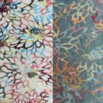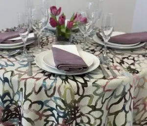 Colorful largescale floral reversible tablecloth and runner.